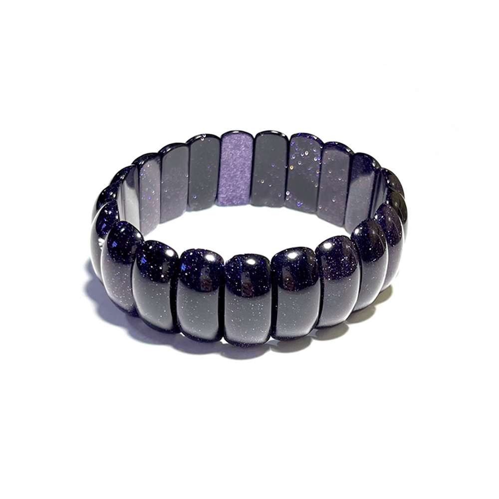 Женский браслет "Каирская ночь" из искуственно выращенного камня авантюрин (звездный камень), фиолетового цвета станет превосходным аксессуаром для повседневного образа. Камни этой модели имеют форму плитки бег огранки, предлагая более тонкий и вытянутый профиль.