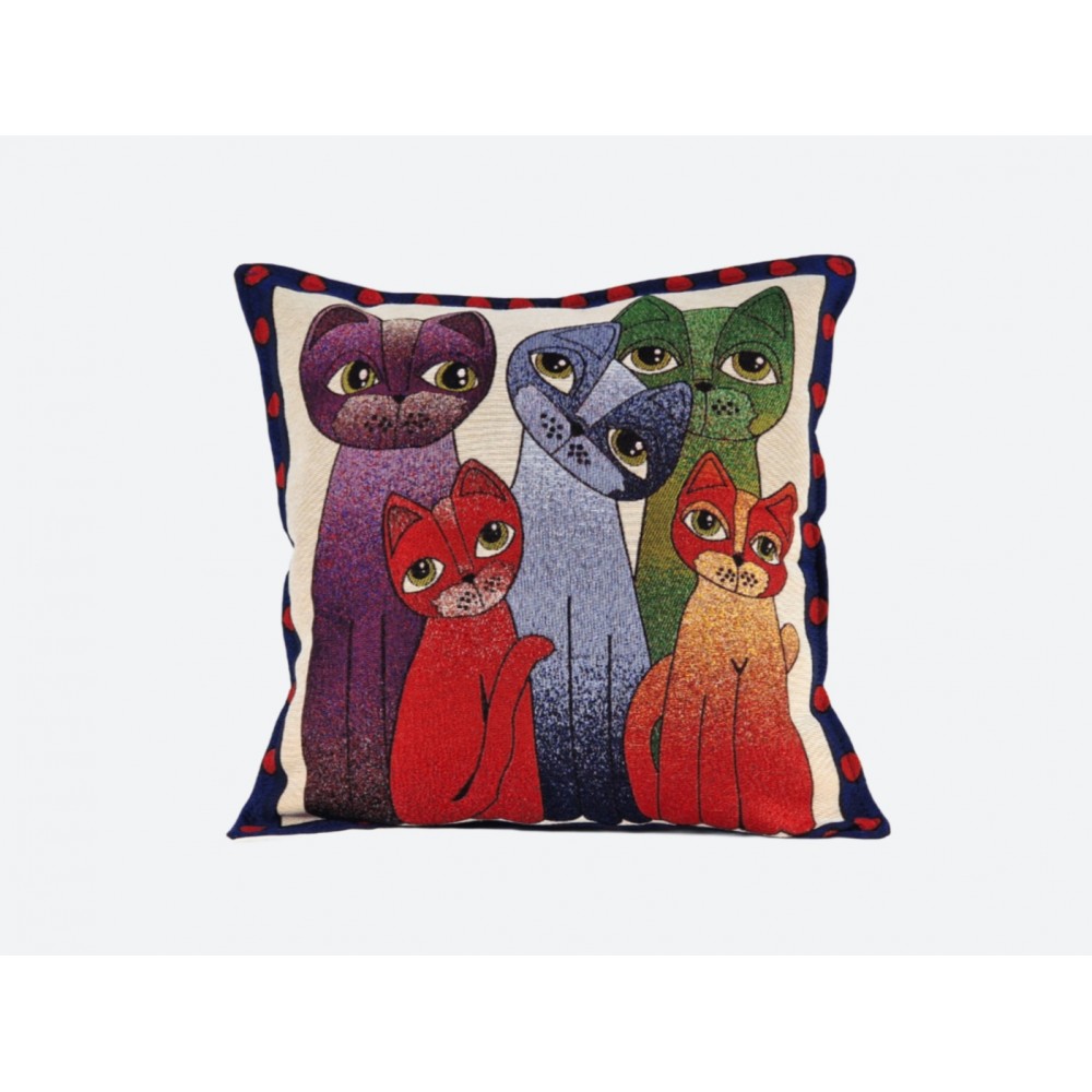 Веселая декоративная подушка, с оригинальной вышивкой в виде пяти котеек в синей рамке с красными кружками, непременно добавит яркости в ваш интерьер и сделает домашнюю или офисную атмосферу более темпой и радостной. Обратная сторона чехла - однотонная, белого цвета.