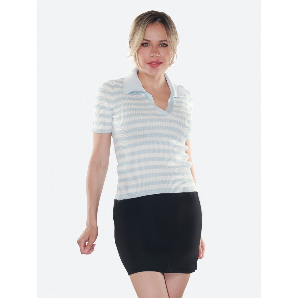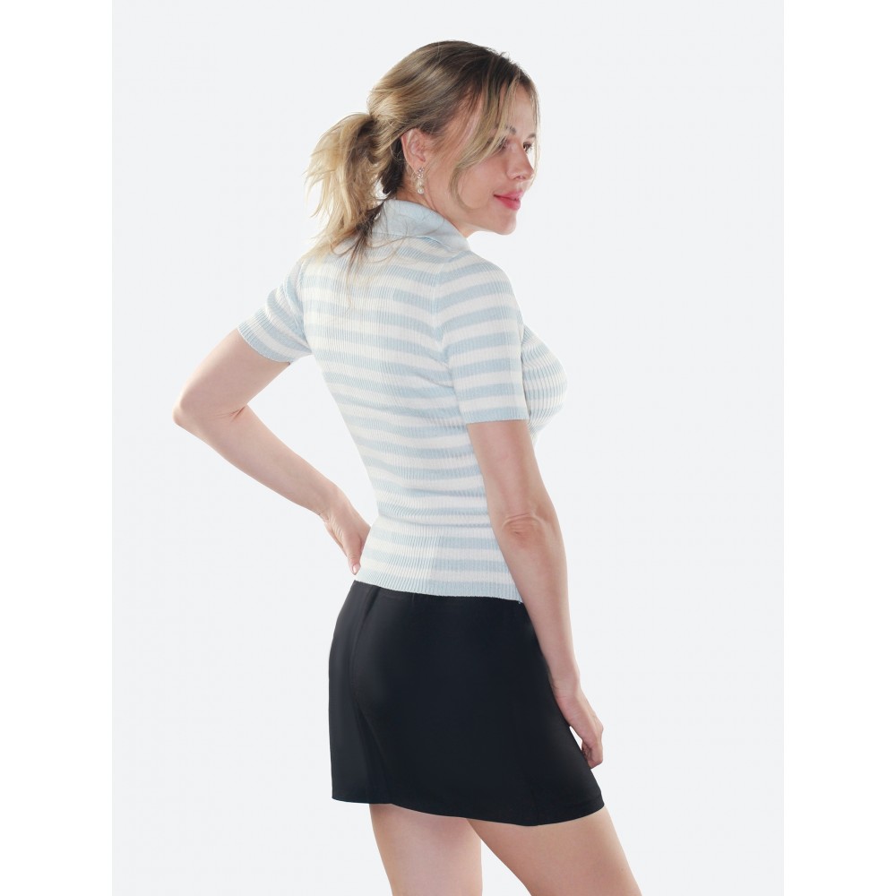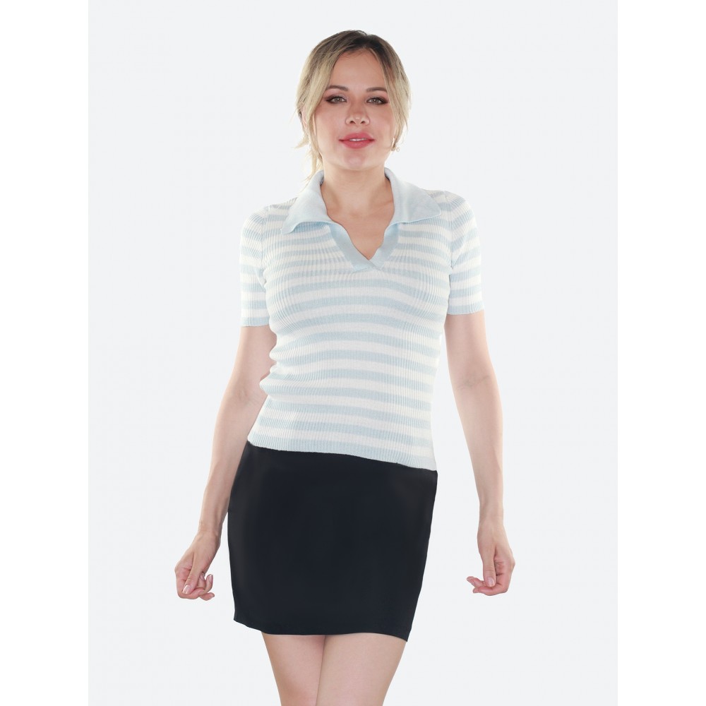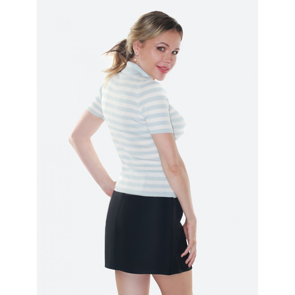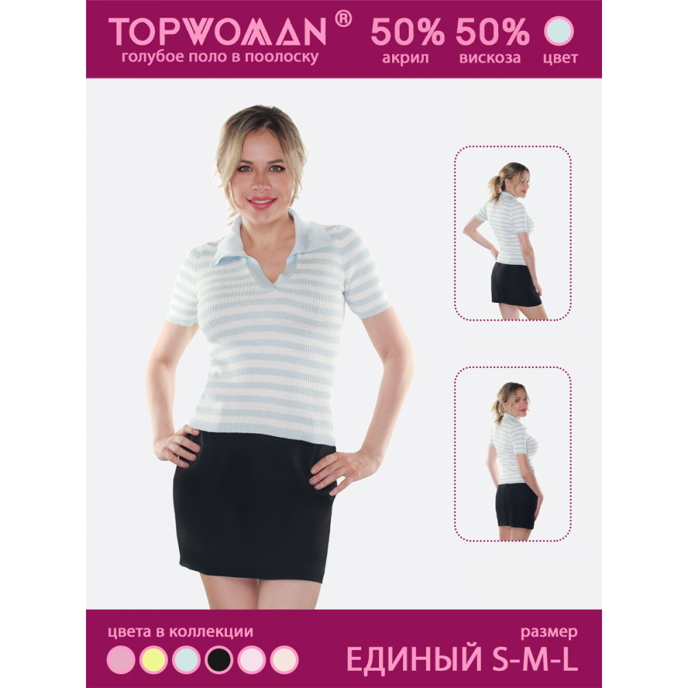 Поло с короткими рукавами от TOPWOMAN - это выигрышный вариант, который привлекательно облегает тело, представляя женские достоинства в наилучшем свете. Также, к образу можно добавить мини-юбку "Черный соблазн", которая одета на модели и хорошо гармонирует с этим топом.