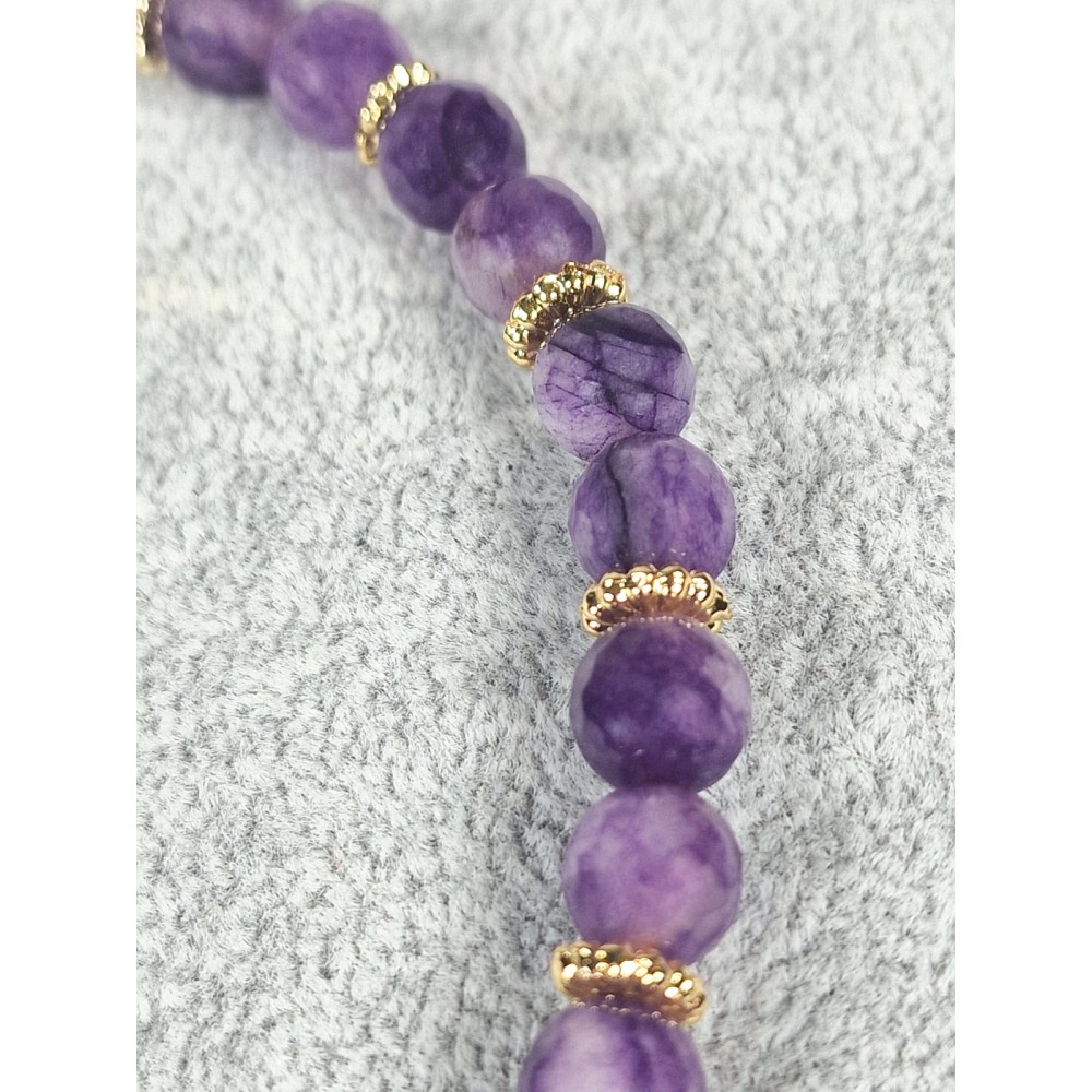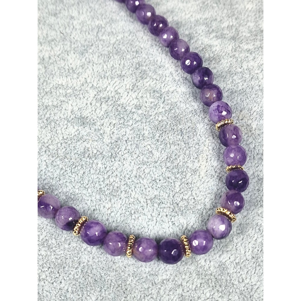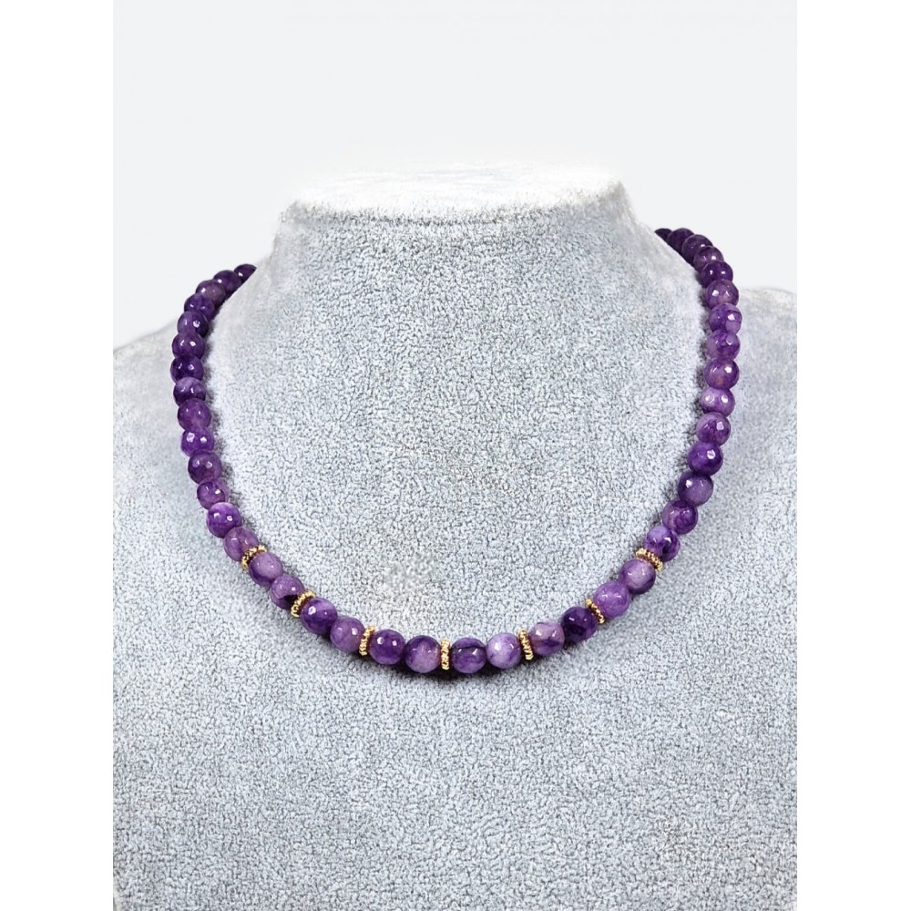 Привлекательные бусы, ручной работы, из натурального аметиста фиолетового цвета и с вставками золотого цвета смотрятся лаконично и сдержанно, поэтому данный вид шейного украшения станет отличным дополнением к повседневному образу. Диаметр бусин из аметиста составляет 8 мм. Размер ожерелья составляет 45 см и считается самым оптимальным, так как подходит к разным вырезам и воротникам.