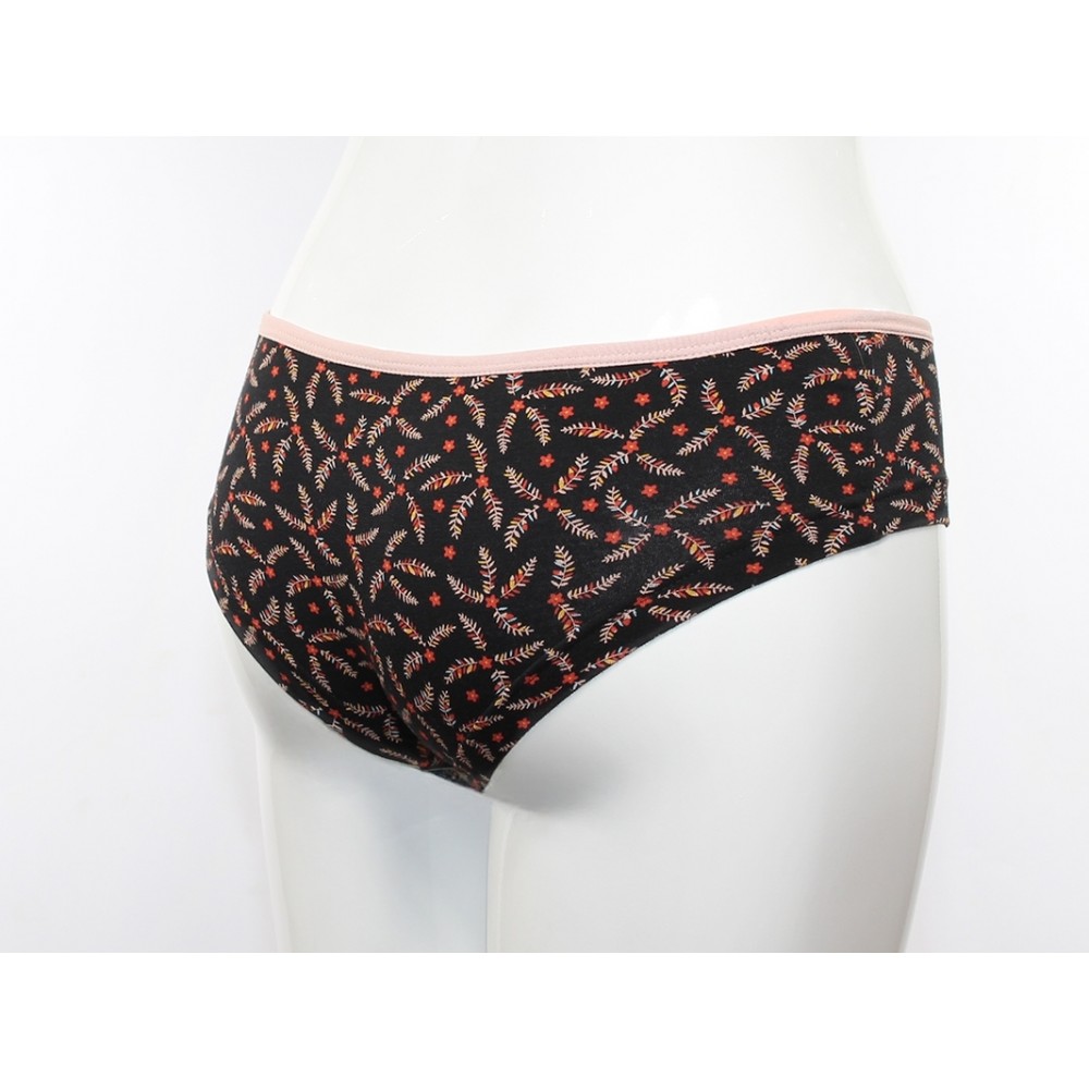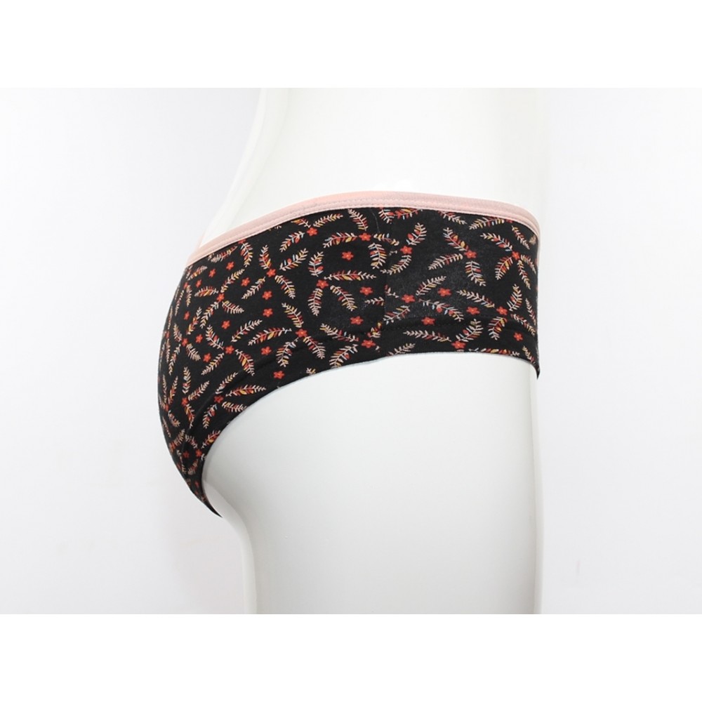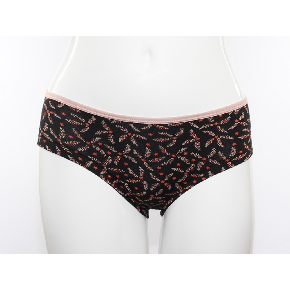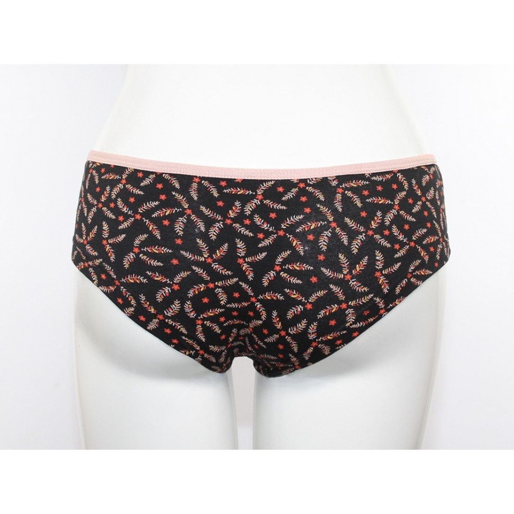 Стильные женские трусы хипстеры черного цвета, с лиственным принтом и с гладкой розовой резинкой. Сделаны из хлопка, из трикотажного полотна, что позволяет коже дышать. Хорошо подчеркивают фигуру благодаря высоким вырезам по бедрам. Изделие комфортное, приятное на ощупь и не сковывает движения.