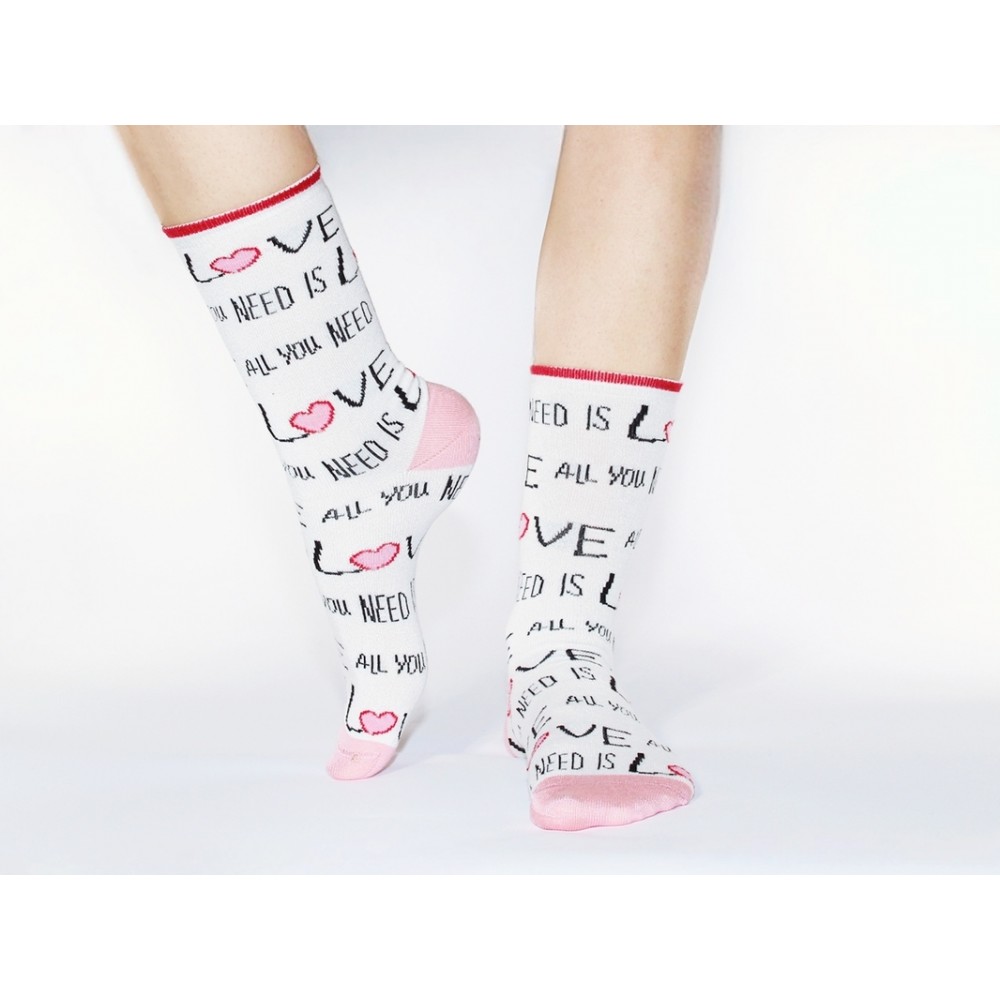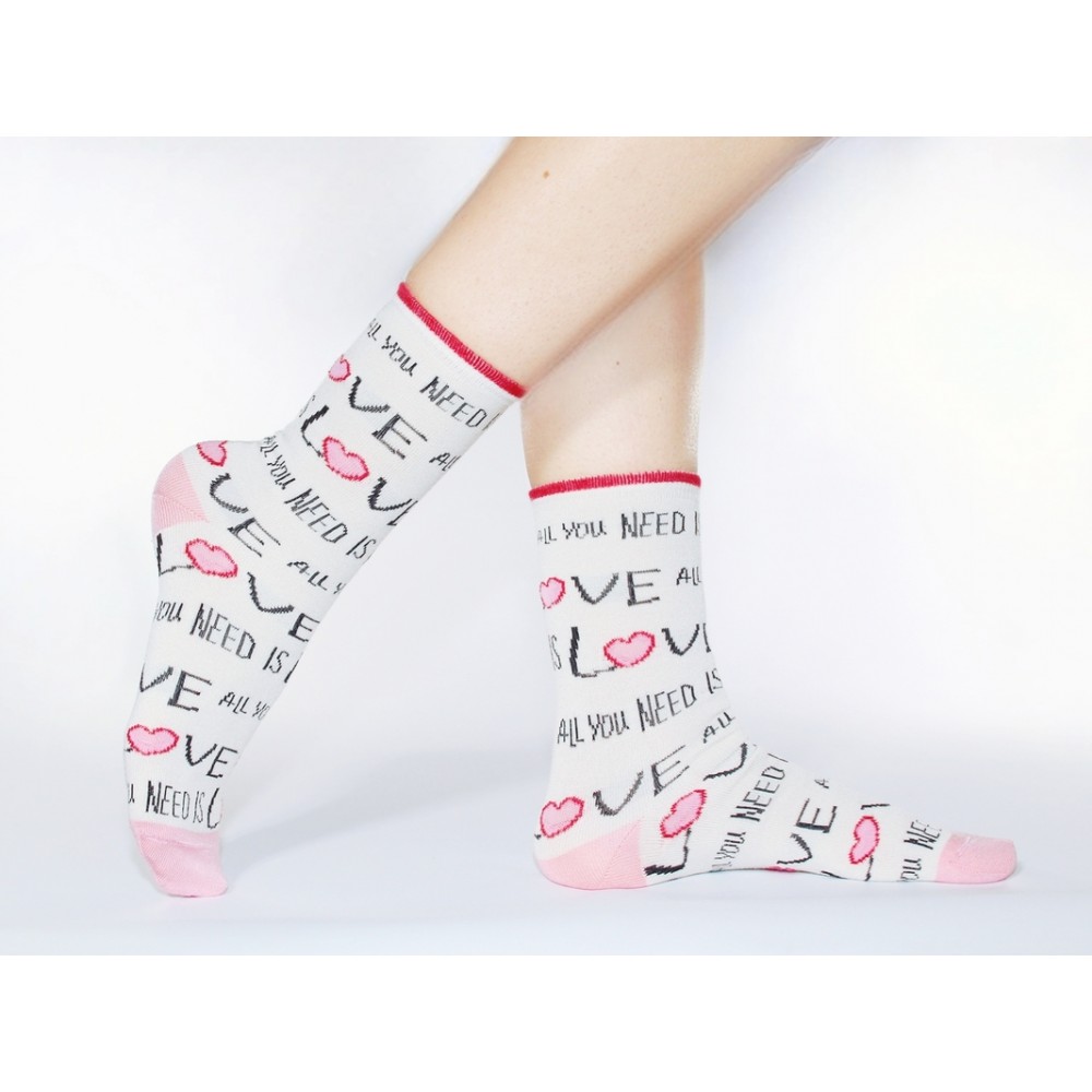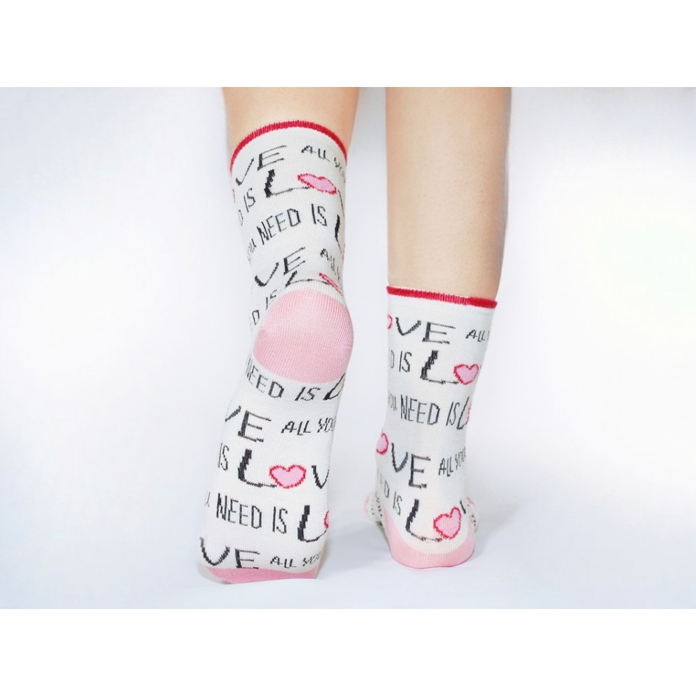 Бамбуковые белые носки cо слоганом "All you need is love" гармонично дополнят ваш повседневный образ и подчеркнут вашу индивидуальность своим оригинальным дизайном. Это носки с высокой посадкой и премиум качества. Они мягкие, эластичные и комфортные. За счет бамбукового волокна носки очень прочные и износостойкие. Хорошо переносят многократные стирки, не линяют, не садятся. Ноги в них отлично дышат. Одно из главных свойств бамбука - это гипоаллергенность, благодаря которому он также подходит людям с чувствительной кожей. Размер изделия единый 36-41.