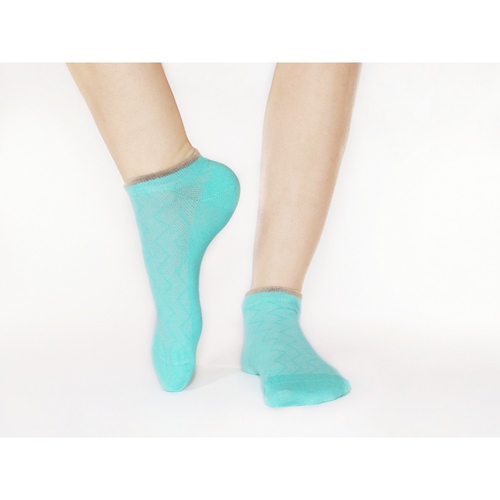 Эти короткие носки из микса бамбука и хлопка аквамаринового цвета с зигзагообразными полосками прекрасно подходят для йоги, танцев, туризма, их можно носить как домашние, спортивные и праздничные. Эти сетчатые носки отлично впитывают влагу и пропускают воздух, а также препятствует образованию грибка за счет своих антибактериальных свойств.