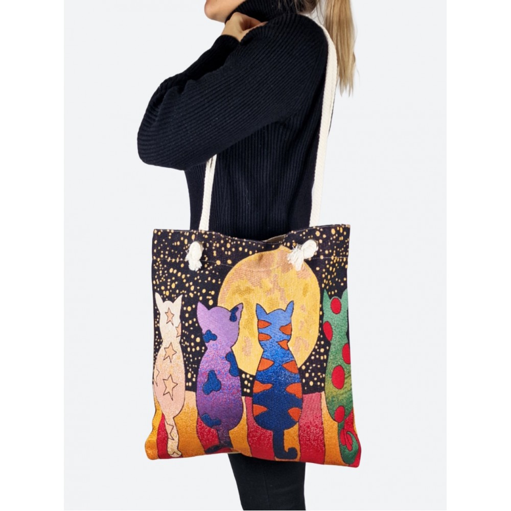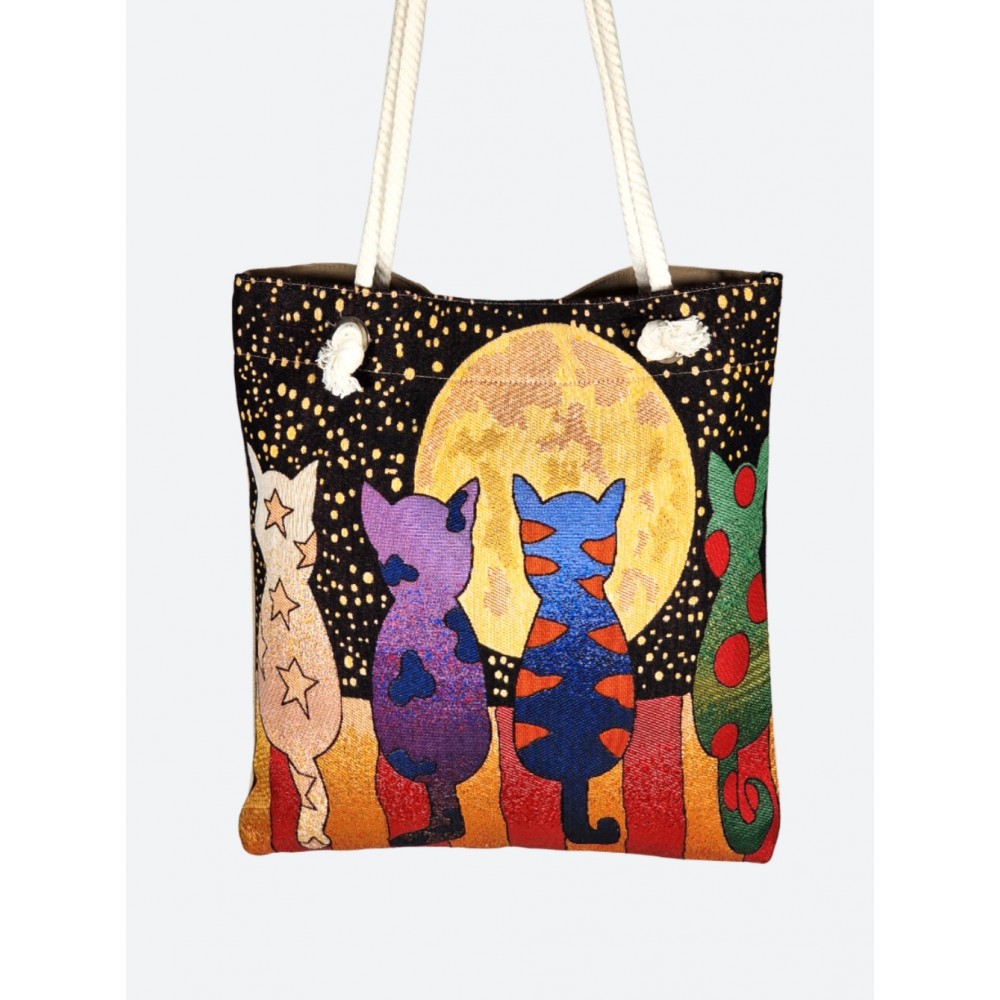 Эта стильная сумка шоппер, станет незаменимым аксессуаром для ежедневных походов по магазинам, прогулок, поездок, а также для работы или учебы. Она комфортно носится на плече на плетеных ремешках. Высота ремешков составляет 45 см или 90 см в длину. На лицевой стороне сумки  выделяется привлекательная вышивка с оригинальным дизайном в виде четырех сидящих котов смотрящих на планету на звездном небе. Обратная сторона белая - однотонная. Застежка на магнитной кнопке надежно закрывает сумку, обеспечивая сохранность ваших вещей.