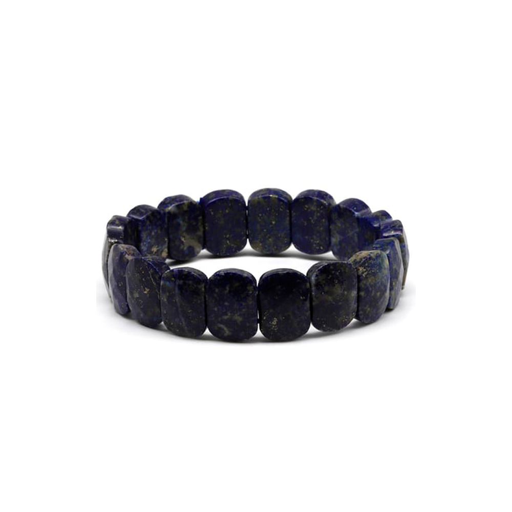 Женский браслет из натурального камня лазурит, синего цвета станет превосходным аксессуаром для повседневного образа. Камни этой модели имеют форму плитки предлагая более тонкий и вытянутый профиль. Огранка кушон или подушка прекрасно улавливает свет, придавая камню более яркие оттенки, которые бросаются в глаза,  делая это украшение более изящным и более статусным по сравнению с каменными браслетами без огранки.