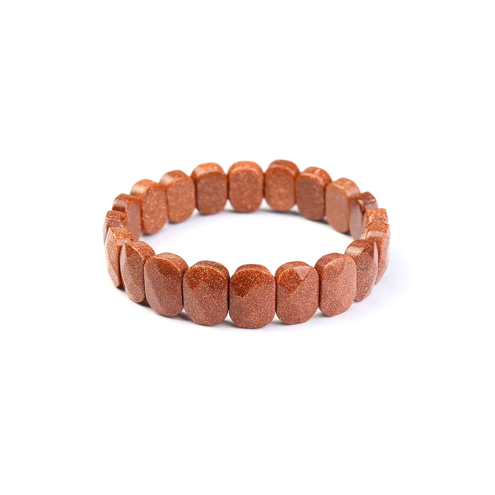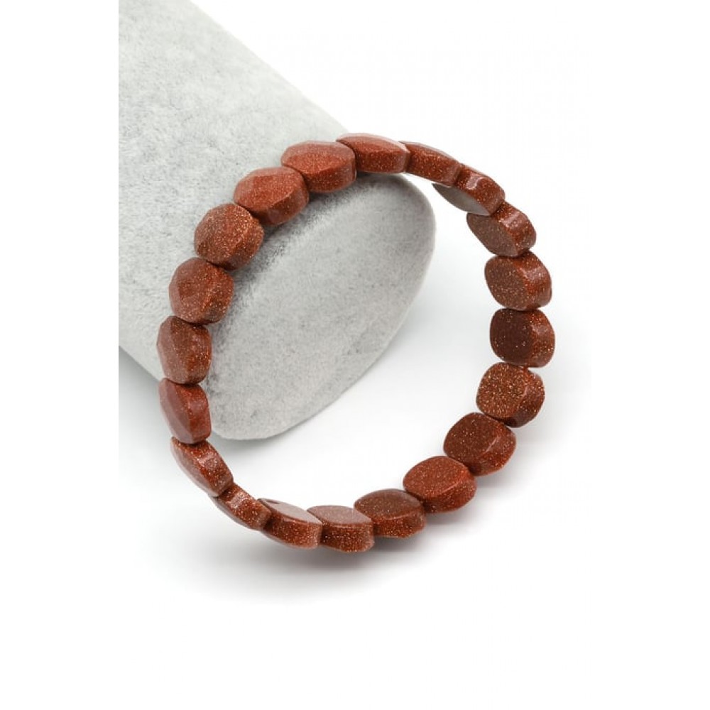 Женский браслет "Золотой песок" из искусственно выращенного камня авантюрин (звездный камень), коричневого цвета станет превосходным аксессуаром для повседневного образа. Камни этой модели имеют форму плитки предлагая более тонкий и вытянутый профиль. Огранка кушон или подушка прекрасно улавливает свет, придавая камню более яркие оттенки, которые бросаются в глаза,  делая это украшение более изящным и более статусным по сравнению с каменными браслетами без огранки.